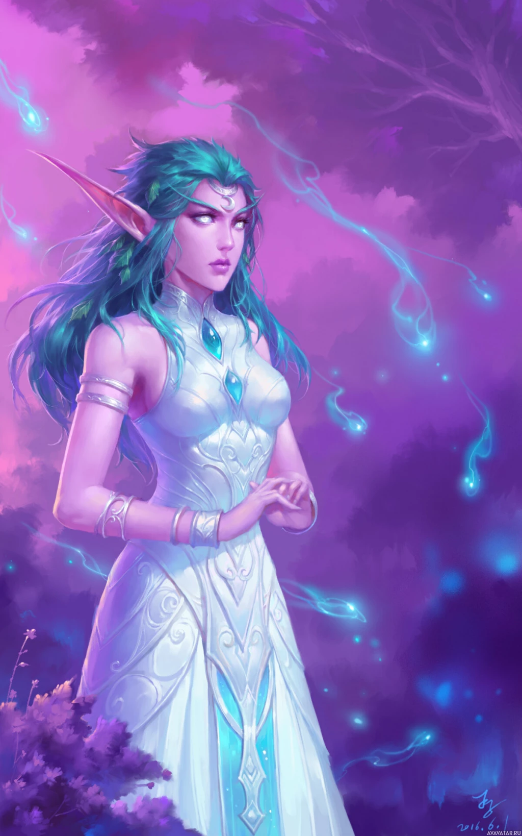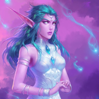 turquoise hair and is wearing what seems to be an enchanted garment with magical effects, as indicated by the lightning bolts that are part of her attire. The setting suggests a mystical or otherworldly environment, which aligns with fantasy themes often found in such depictions.