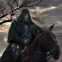 Geralt of Rivia, known by his moniker "the witcher," and he is depicted riding on horseback. He is wearing