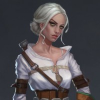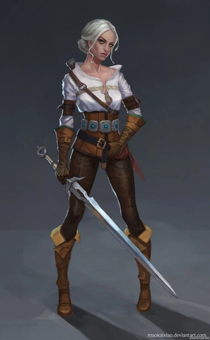 The image shows a 3D rendering of a character that appears to be Ciri from the "The Witcher" series. She is depicted wearing a white,