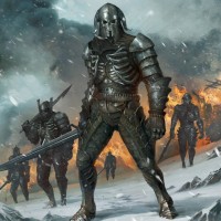 a fantasy setting. This central figure stands upright and appears to be wielding a sword. Surrounding this figure are other figures who also seem to be warriors or soldiers, some of whom are wearing similar armor with skull-like designs on it. They are standing on