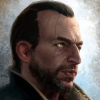 dark hair and a full beard, suggesting he might be a protagonist or an important figure within the game's narrative. The artwork conveys