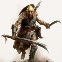 a muscular build, wearing armor and carrying weapons. He has pointed ears characteristic of