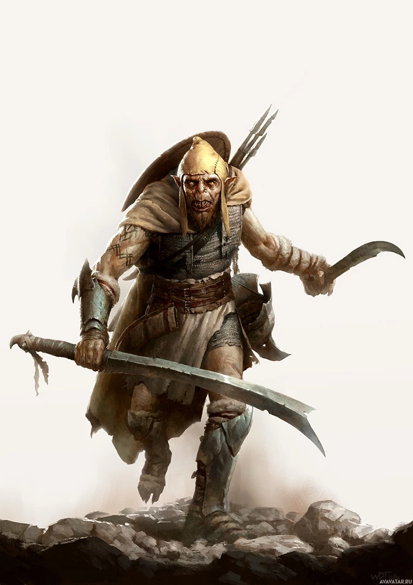 the fantasy orc race, and his expression is intense as if he's in the middle of combat. The artwork conveys