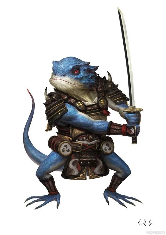 a fantasy creature resembling a frog or a lizard. This creature is anthropomorphized, standing upright and dressed in what seems to be armor, with one hand holding a sword. It's wearing a helmet and has