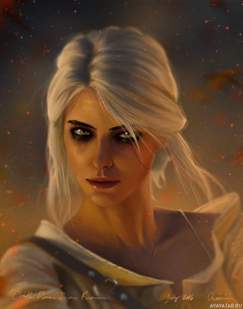 blonde hair, green eyes, and a determined expression. Ciri is