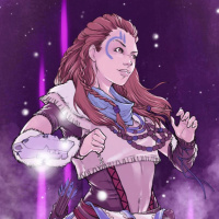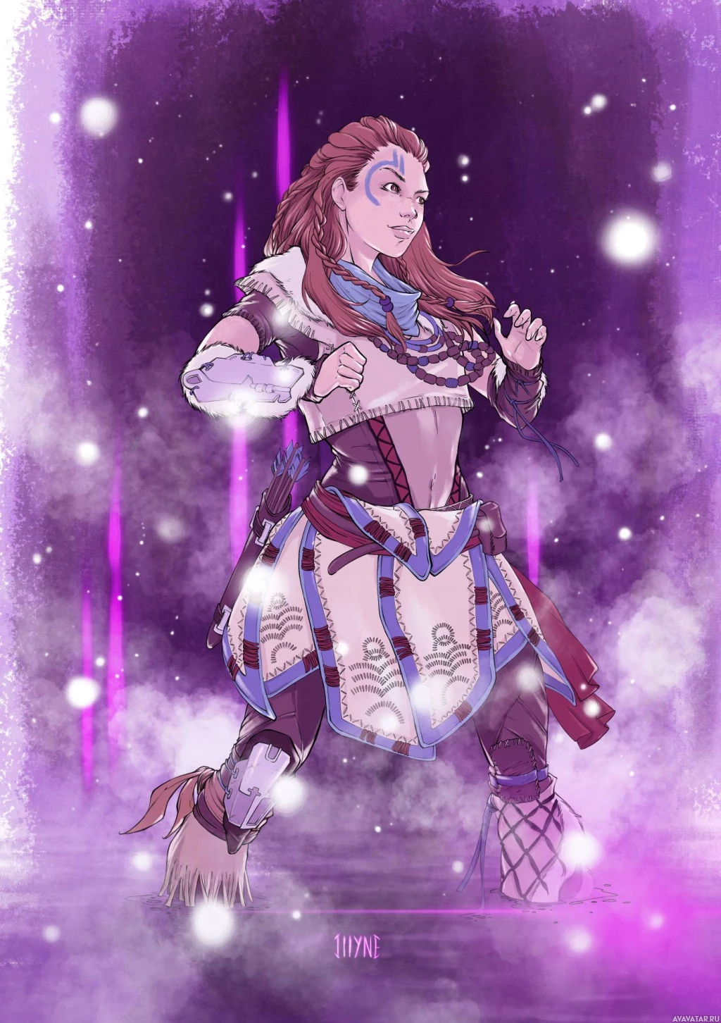 the video game "Horizon Zero Dawn." The character is dressed in traditional tribal attire, which includes elements such as bone armor, leather straps, and