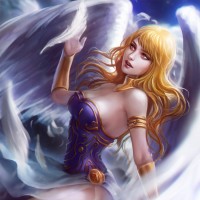 large wings that are spread out behind her, suggesting an angelic or mythical theme. She's wearing a purple and gold armor-like dress, which adds to the fantasy element of the artwork. The background is minimalistic with