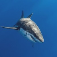 white shark, which is known for its size and predatory nature. It is swimming in deep