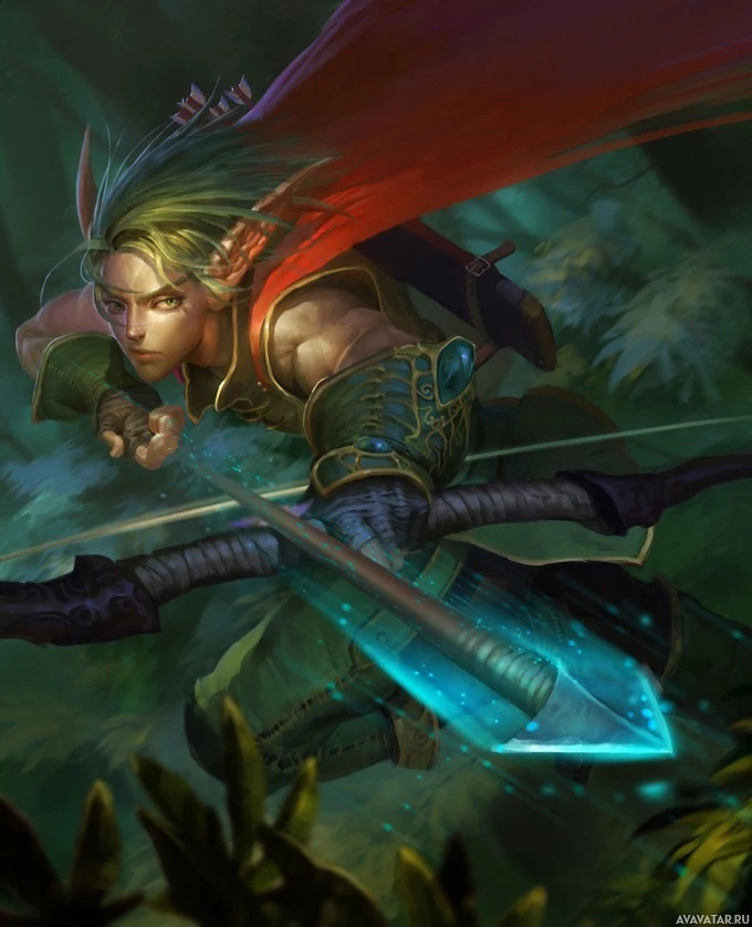 green hair which is often associated with elves in popular culture. They are holding a bow and arrows, suggesting they may be proficient in archery. The attire includes a cape or robe that adds to