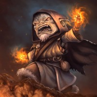an angry expression. They are wearing what looks like a monk's or robe-like outfit with a hood, which suggests they might have a mystical or spiritual role within the story they represent. The background gives off a sense of being on a hill or
