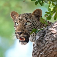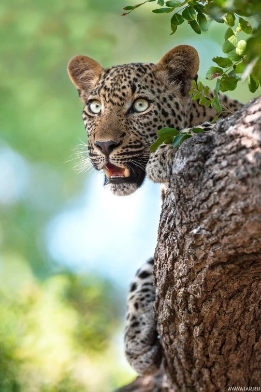 a tree trunk. The leopard is facing the camera with an open-