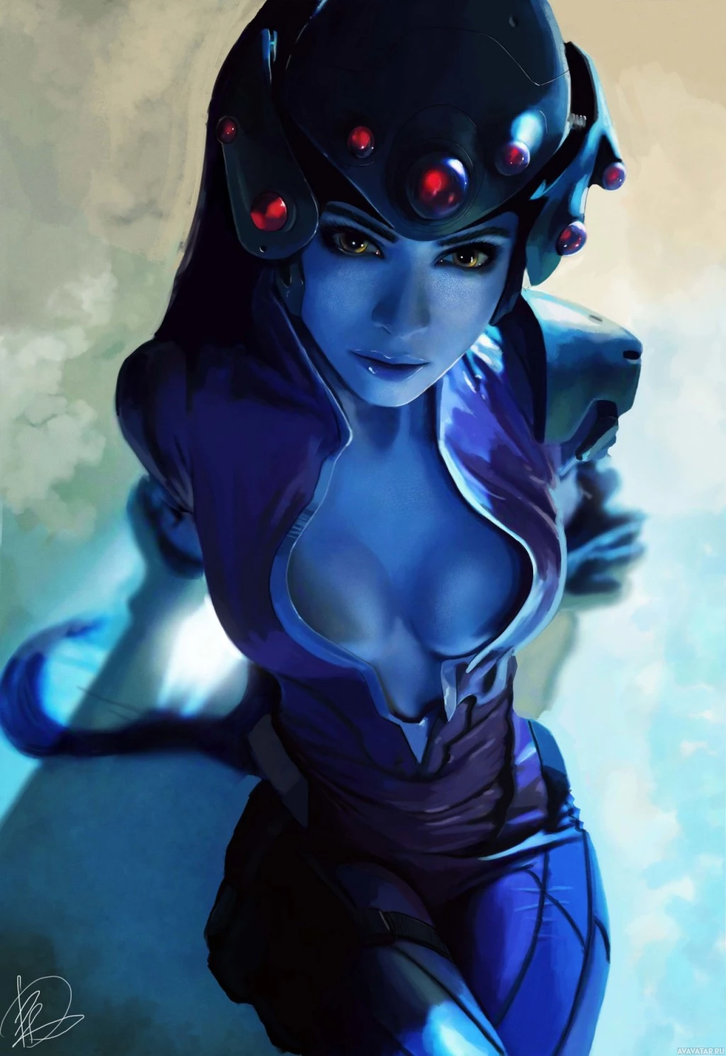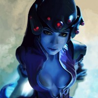The image shows a female character from the video game "Overwatch," specifically, Widowmaker. She is depicted in a stylized and artistic manner, wearing her signature armor with the sniper rifle she uses in the game.