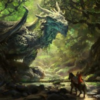 The image depicts a fantasy scene with a rider on horseback encountering a large dragon in an enchanted forest. The dragon has intricate details, suggesting it's of mythical or magical origin. There are trees and foliage that indicate the environment is lush and verdant. The interaction between the rider and the dragon gives off a sense of adventure and the unknown.