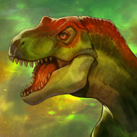 Картинка показывает иллюстрацию T-Rex, который является видом динозавра. Он изображен с открытым ртом, как будто он ревет или, возможно, реагирует на что-то. Фон имеет космическое ощущение с туманностями и звездами, предполагая сцену из доисторических времен, установленных в ночном небе.