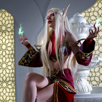 fantasy costume that resembles an elf, typically associated with the Warcraft series. The individual has long