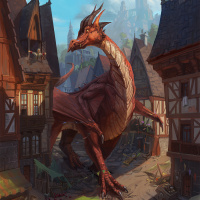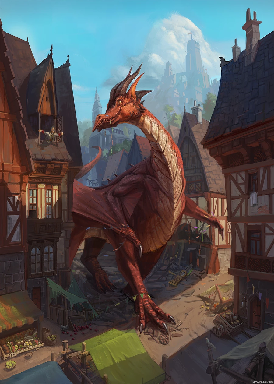 a fantasy scene with a red dragon as the central figure. The dragon is standing in the middle of what appears to be a quaint village or town setting, surrounded by buildings that have a medieval architectural style. There are also