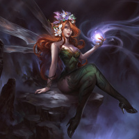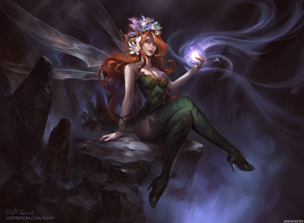 a fantasy character. She is red-haired and appears to be depicted as a fairy or similar
