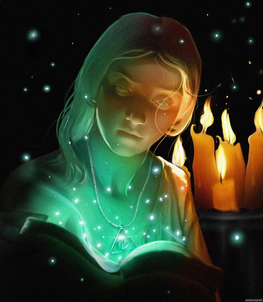 a dark setting that could suggest nighttime, and there are lit candles nearby that add to the mystical ambiance of the scene. The overall atmosphere of the image is enigmatic and otherworldly, fitting within the realm of fantasy artwork.