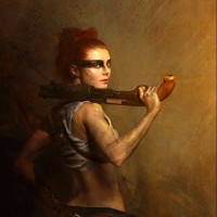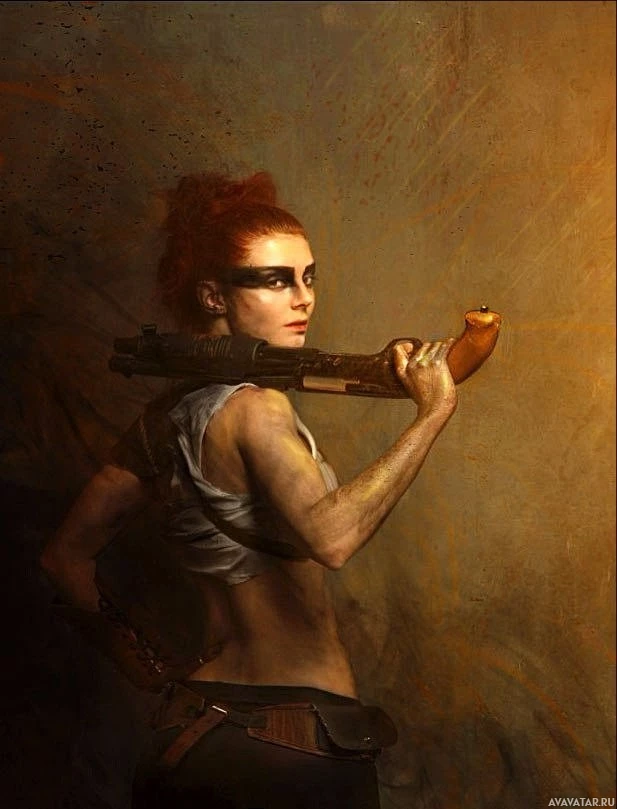 Картинка показывает женского персонажа сзади. У нее рыжие волосы, и она носит то, что кажется доспехом или жилетом над ее плечом, с пистолетом, надетым на грудь, предполагая, что она может быть вовлечена в бой или приключение. Ее выражение серьезное и сосредоточенное. Фон имеет текстурированный вид, возможно, указывающий на то, что изображение представляет собой живопись или цифровое произведение искусства, призванное вызвать историческую или фэнтезийную обстановку.