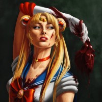 a bloody heart pierced through with a sword in her right hand, suggesting a dramatic or possibly violent scene. The image is stylized in a way that's reminiscent of