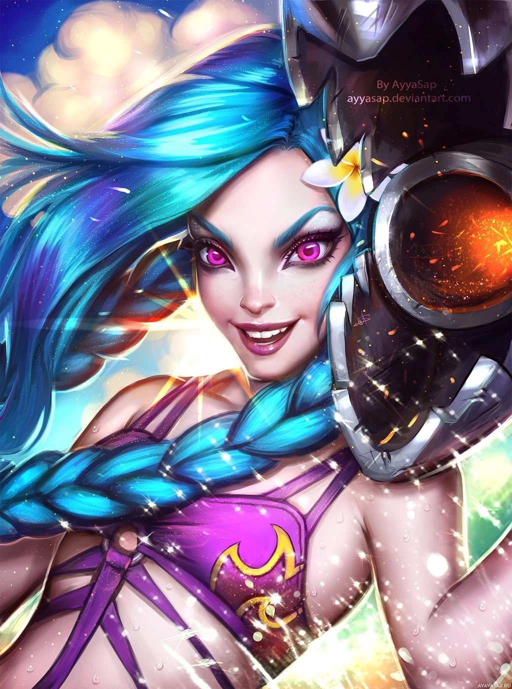 blue hair and a purple outfit, which are iconic elements of her design within the game. The background suggests a magical or fantastical setting, fitting for her character's abilities within the game.