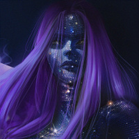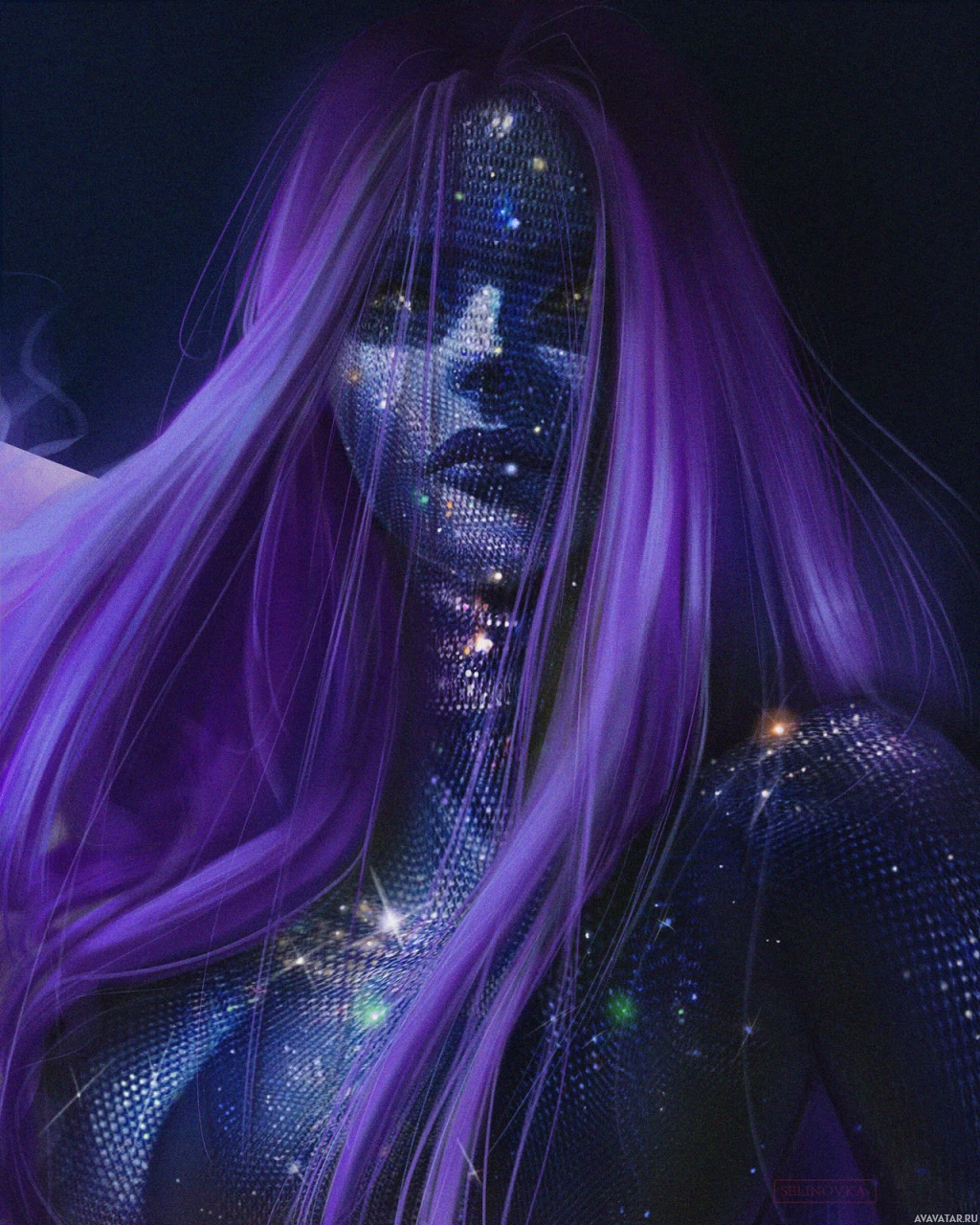 purple hair. She has an ethereal, otherworldly appearance and seems to be floating or levitating in the air. Her skin is translucent, and she appears to be made up of stars, giving her a cosmic or celestial quality. The background is dark, which contrasts with her bright, star-like complexion. It's a visually striking image that combines elements of fantasy and