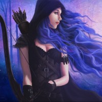blue hair and a hood, holding a bow. She is dressed in attire that could be associated with archery or