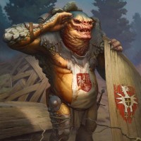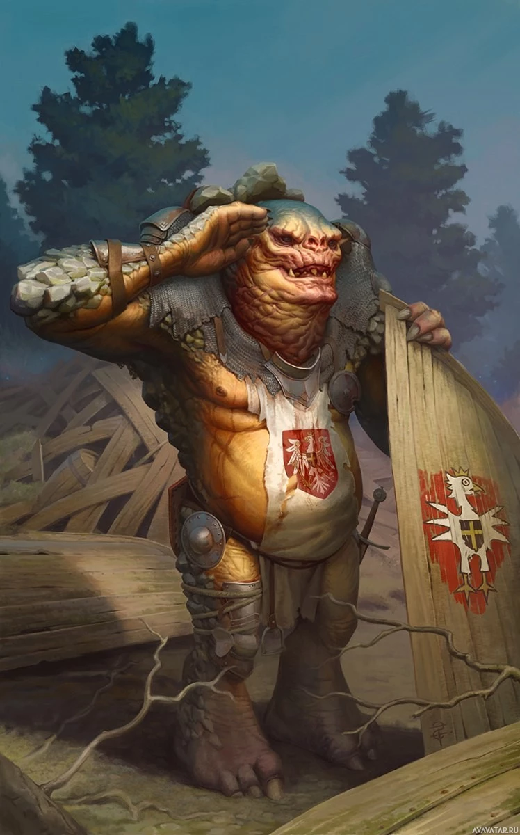 The image shows an illustration of a creature that appears to be a troll from the "The Witcher" game series. This character is wearing armor and holding a shield, which suggests it might be ready for combat or on duty. It has a menacing appearance with