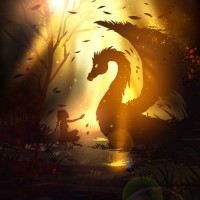 a large portion of the background. The dragon has a detailed silhouette against the backdrop of a misty forest, suggesting it is either
