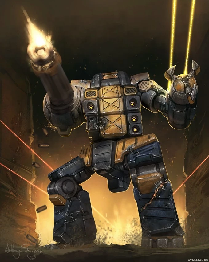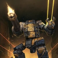 a humanoid robot with various mechanical details such as pipes and wires indicating its technological construction. The robot is holding what looks like a weapon in its right hand, ready for combat. The background suggests a battlefield or war-like scenario, with elements that could be part of the environment or