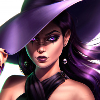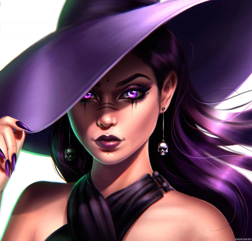 a young woman with purple hair, wearing a black hat and a black top. Her makeup is done in
