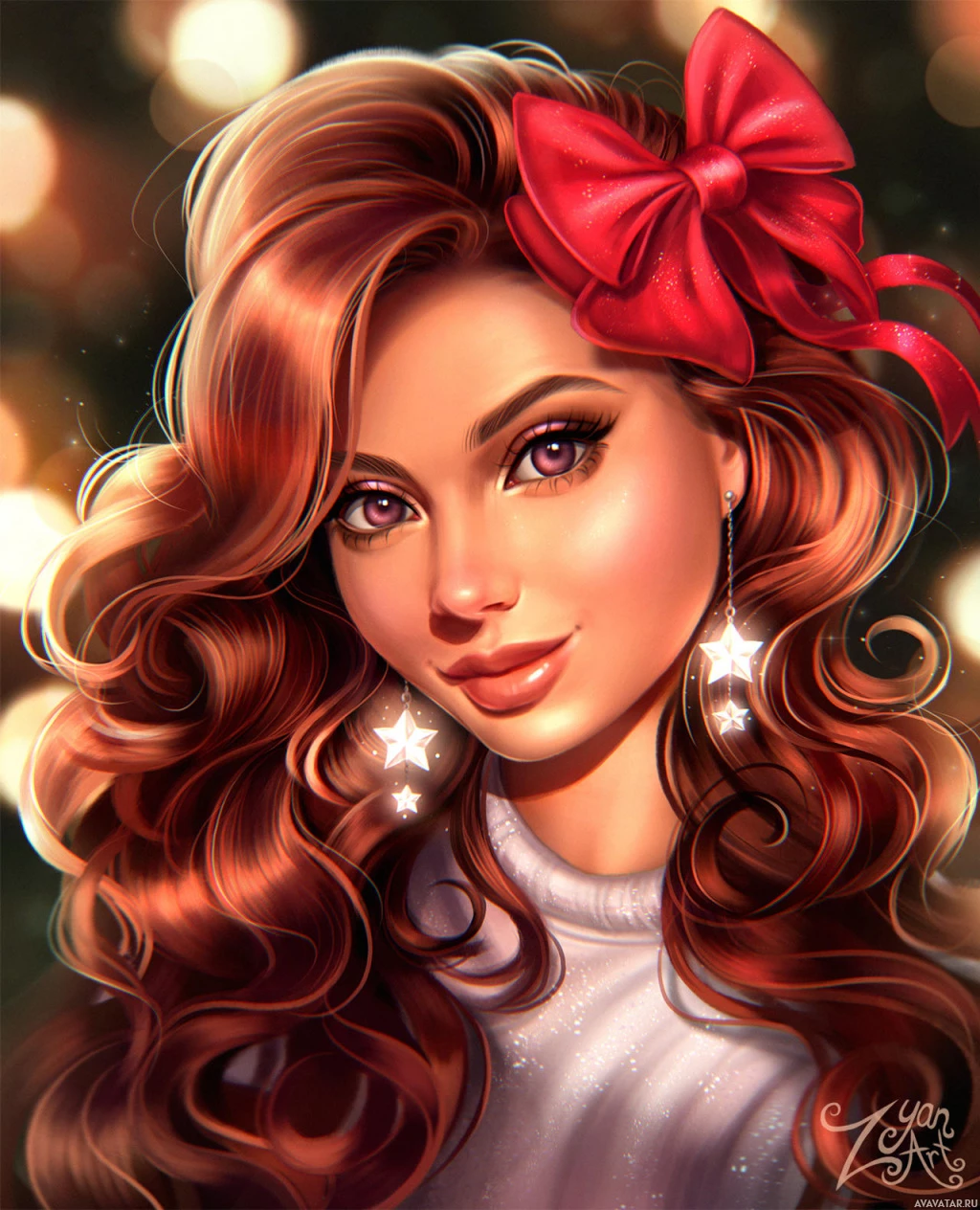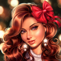 the red bow she's wearing on her head. Her makeup includes defined eyebrows, eyeshadow, mascara, and nude