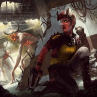 a fantasy scene with an individual who appears to be a warrior or adventurer. They are standing in front of a ruined building, surrounded by ominous figures that could be interpreted as demonic or