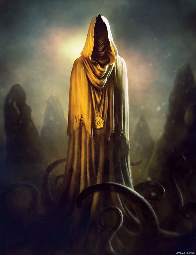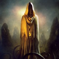 The image depicts a dark and fantastical scene. In the center, there is a figure that appears to be