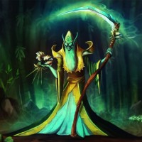 a hooded cloak and a staff, surrounded by dark, misty foliage that suggests a forest or swamp environment. His attire includes blue and yellow colors, which may imply a magical or mystical nature to his character within the game. The image has