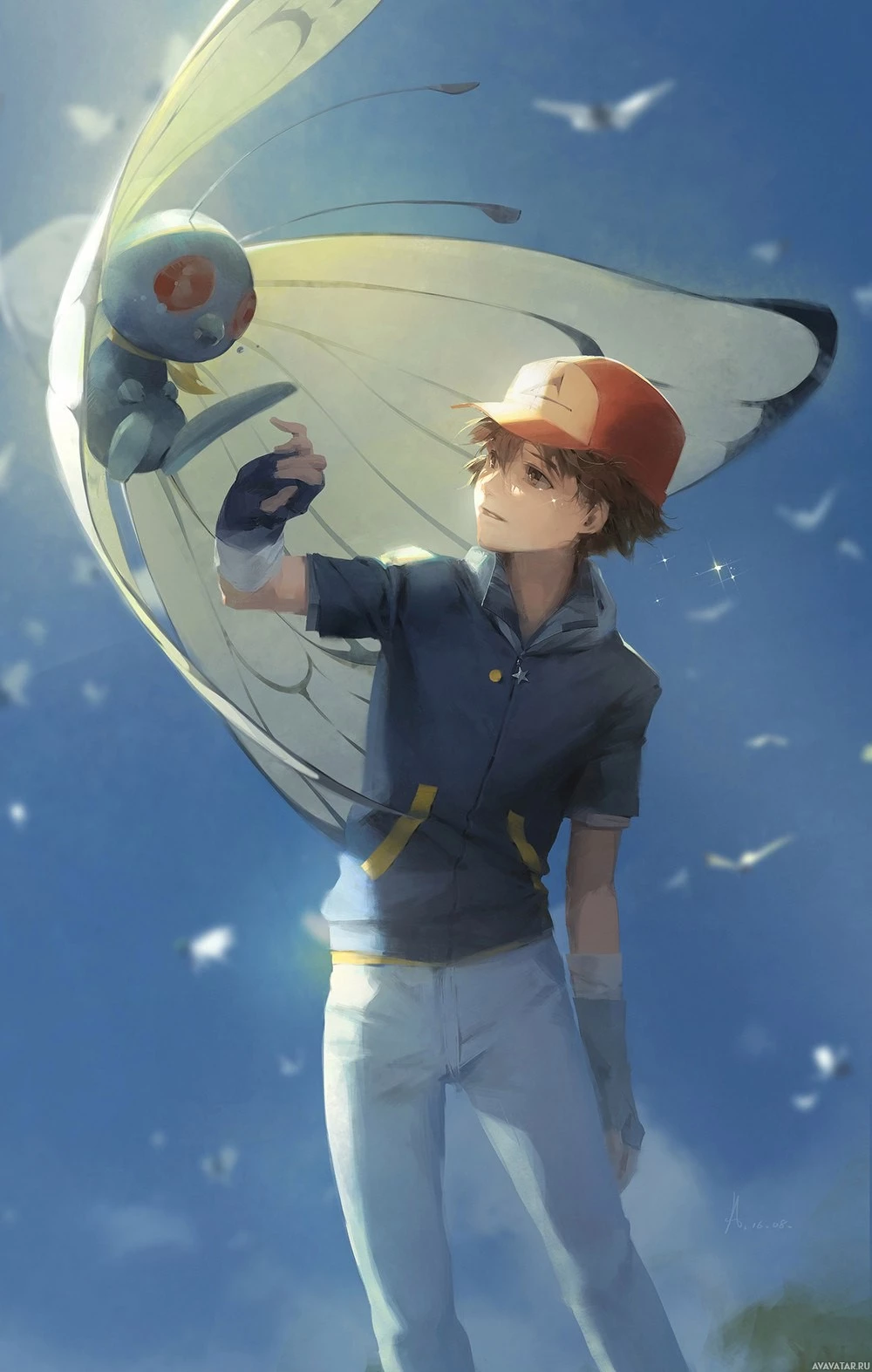 blue sky and clouds as the background. The character is holding what seems to be a Pokémon, which might be his signature Pikachu, given the recognizable