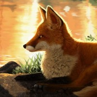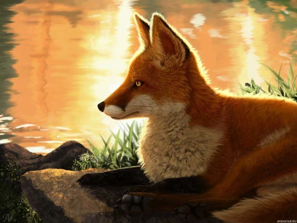 The image features a fox sitting on what appears to be a rock near water, likely a river or stream. The background suggests it is either dawn or dusk, given