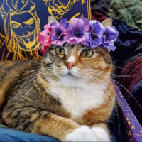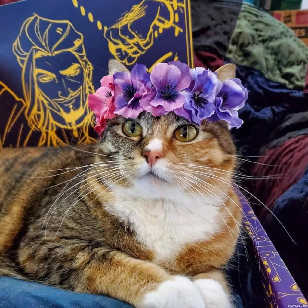 a floral headband. The cat appears to be a calico, which is characterized by its