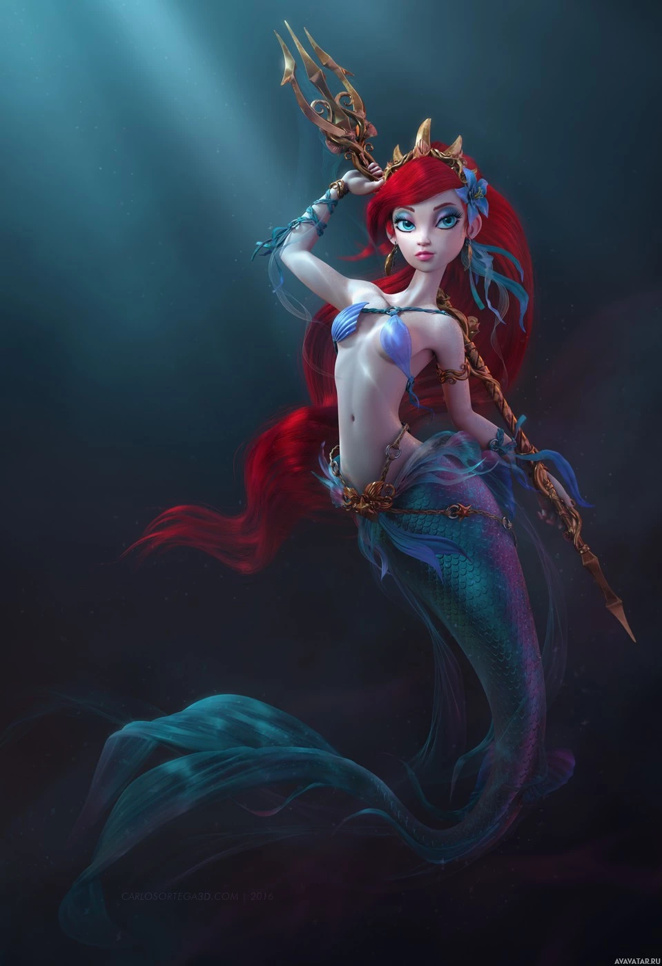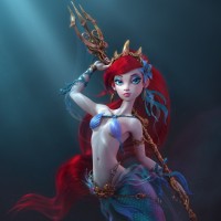 red hair. She is depicted in a fantasy style, wearing a crown on her head and holding what appears to be a trident or a staff. The mermaid is also adorned with various