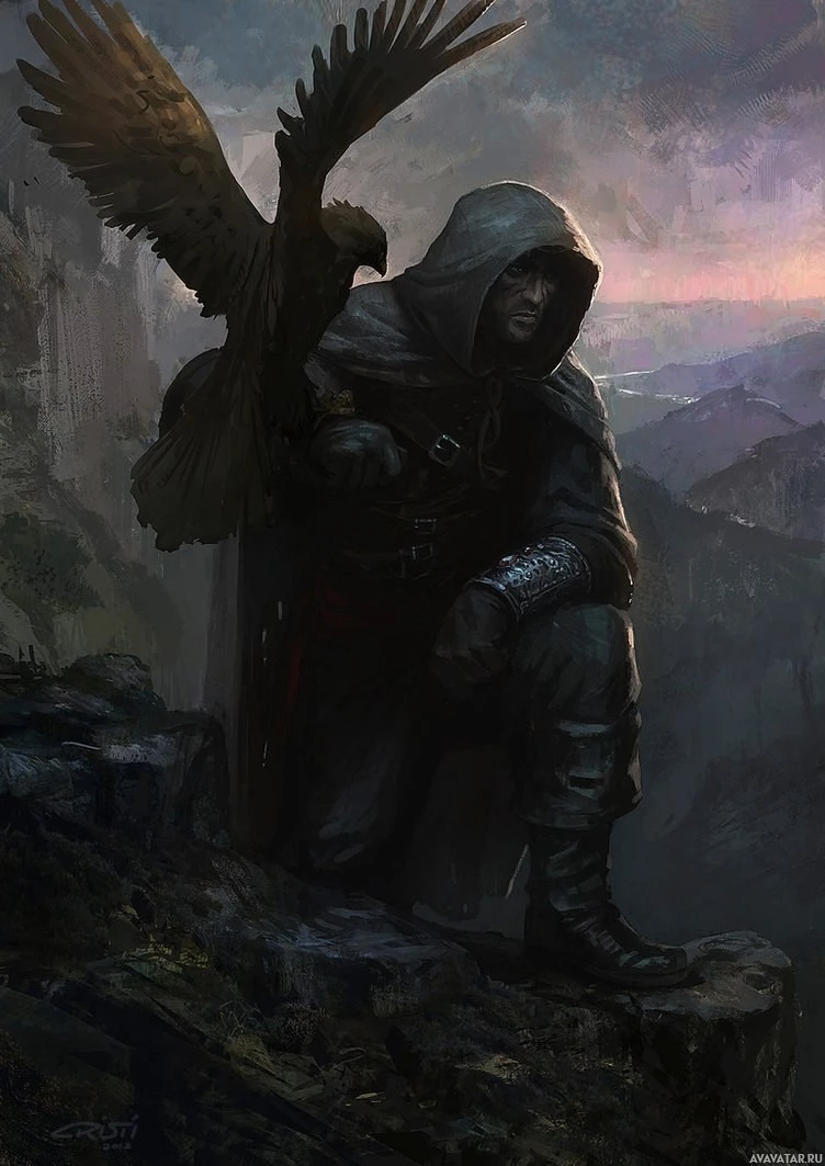 a hooded cloak sitting on rocky terrain with his arms crossed. He has