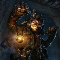 mechanical device attached to their head or neck, which could imply they are some kind of inventor, engineer, or adventurer. The style of the artwork leans towards dark and moody, possibly indicating that the scene takes place in a dungeon or a hidden