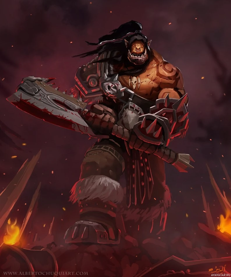 a battle scene with fire and destruction around. The orc has a fierce expression, wearing what looks like armor and carrying the weapons in a threatening manner, which is typical for warriors of this