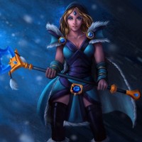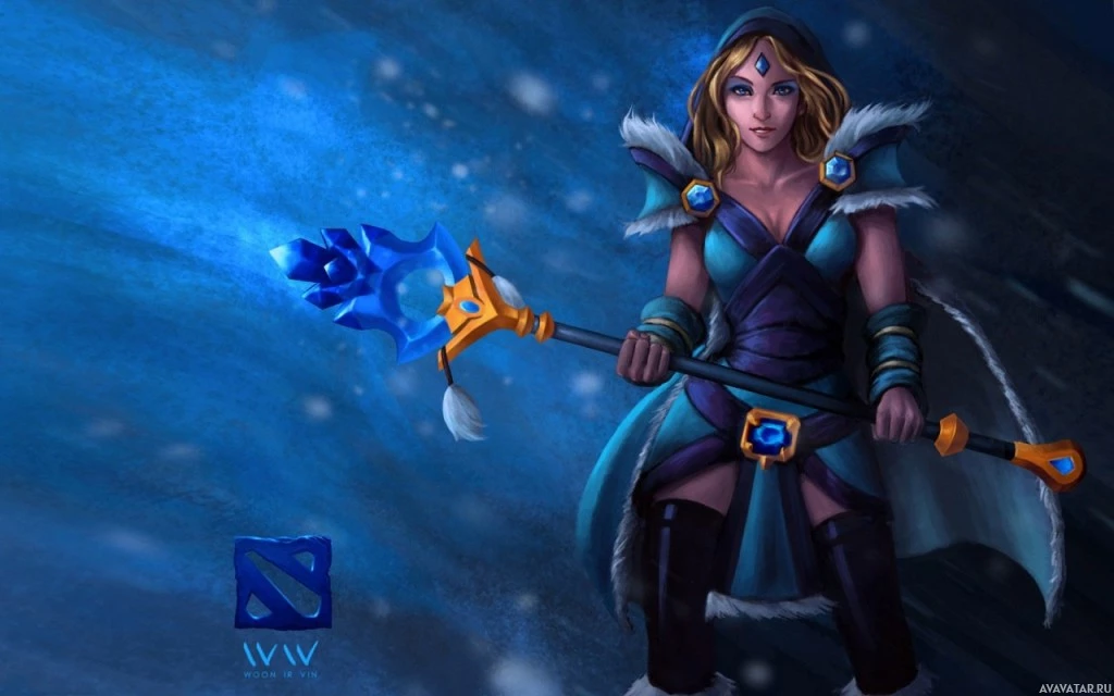 the video game "Dota 2" known as Crystal Maiden. She is shown holding an axe in one hand and a shield in the other, while wearing armor that suggests she is a warrior-