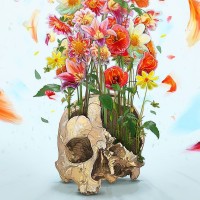 На картине изображена художественная композиция с черепом и цветами. Череп расположен внизу, действуя как ваза для букета красочных цветов. Цветы расположены таким образом, что они, кажется, растут из черепа, создавая сюрреалистическое и символическое произведение искусства.