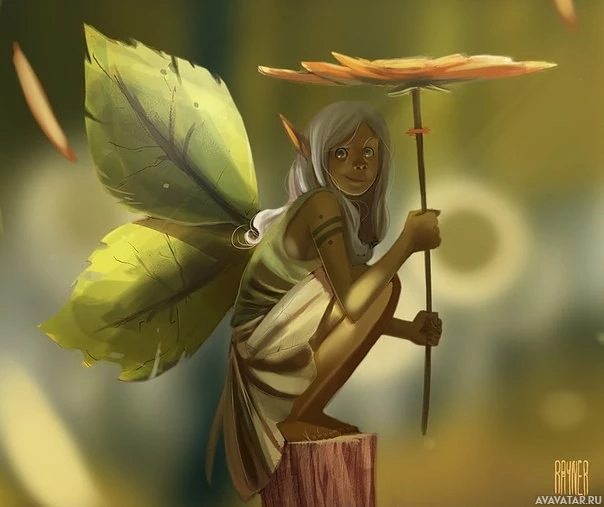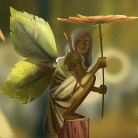 long hair with green hues, possibly indicating a connection to nature or magic. Her outfit includes what appears to be leaves or feathers integrated into the design, reinforcing her fairy-like appearance. The background is softly blurred, emphasizing the magical and enchanted atmosphere of the scene.