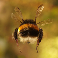 The image shows a bee flying near some foliage. Bees are known for their role in pollinating plants, and they can be found on flowers or around vegetation. This particular bee has the characteristic yellow and black stripes often associated with