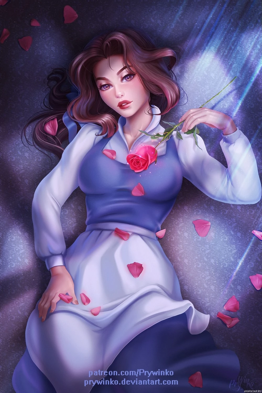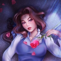 an illustrated character, a girl with long brown hair and a rose in her hand. She is wearing