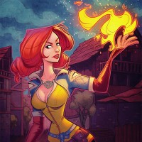 an outdoor setting that looks like a village or small town at night, with a dramatic sky featuring clouds and some sort of fire or magical energy emanating from her hand. Her attire suggests she has some form of