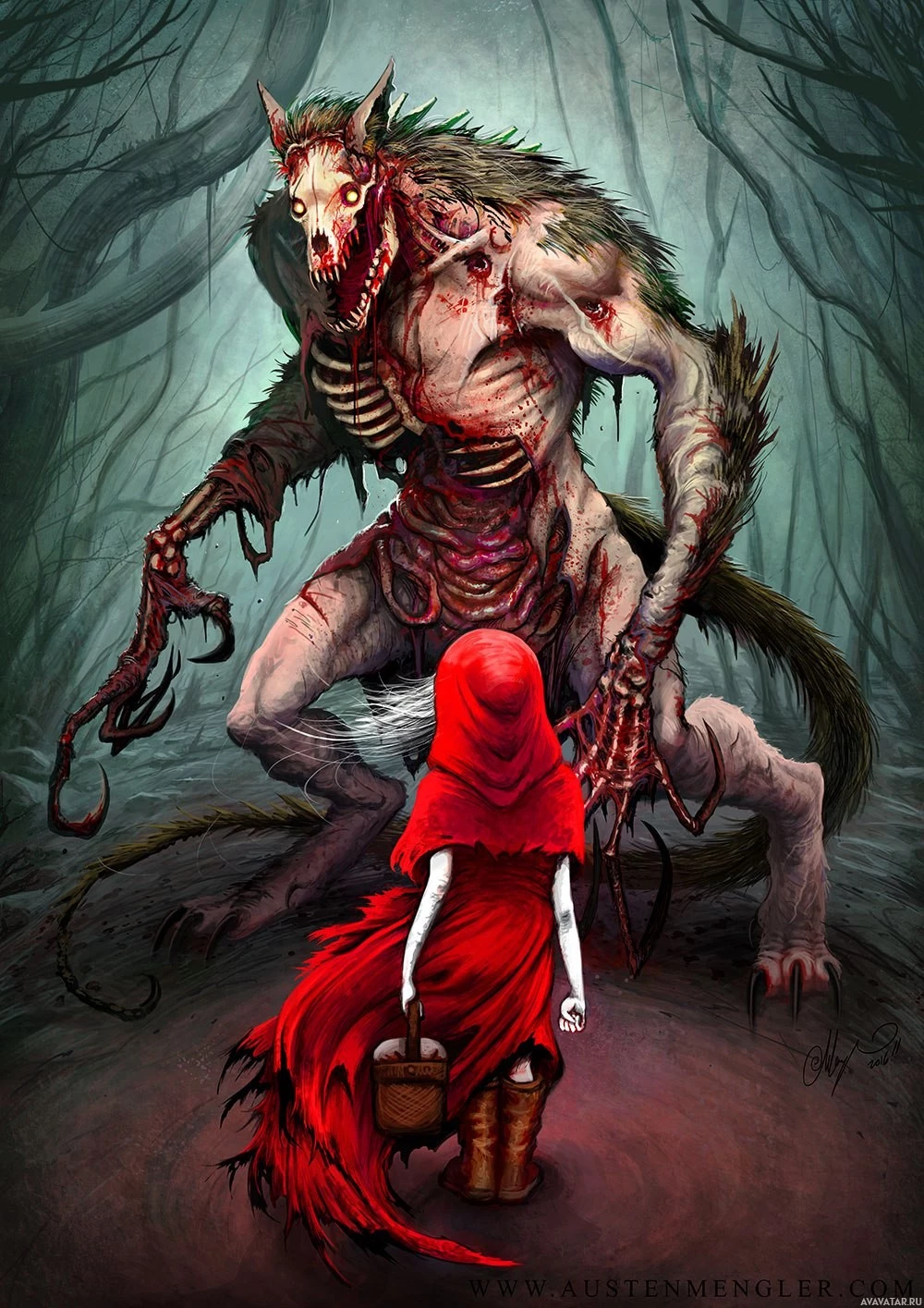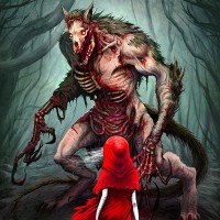 fairy tale "Little Red Riding Hood." In this version, however, the werewolf has been replaced by what appears to be a zombie-like creature. The zombie is menacingly approaching Little Red