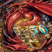 fantasy genres. The dragon is lying on the ground among various items, including what appears to be jewelry or treasure, which might suggest a theme of wealth or greed often associated with